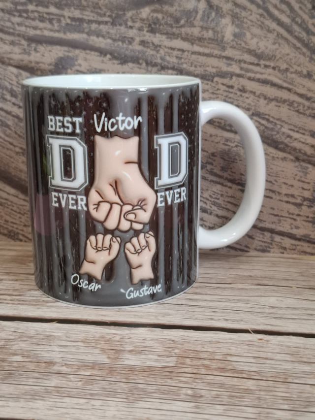 Avec son effet 3D gonflé, ce mug unique et plein d'émotion représentant les poings d'un papa et de ses enfants avec chacun de leur prénom.